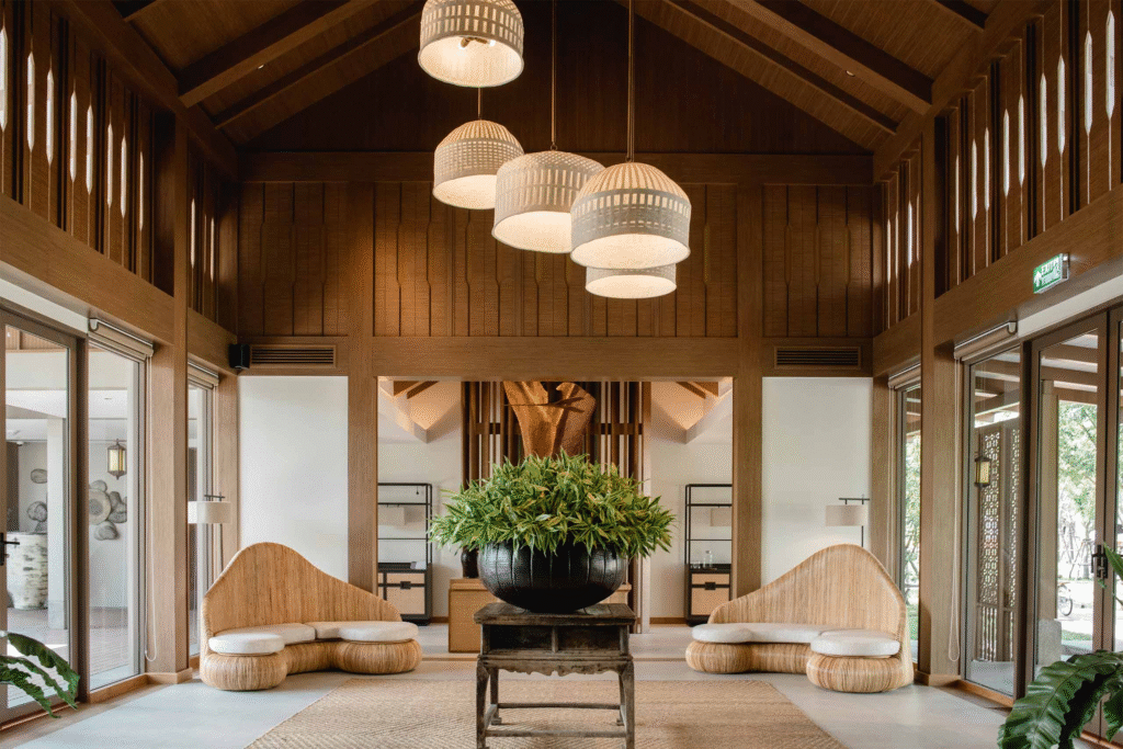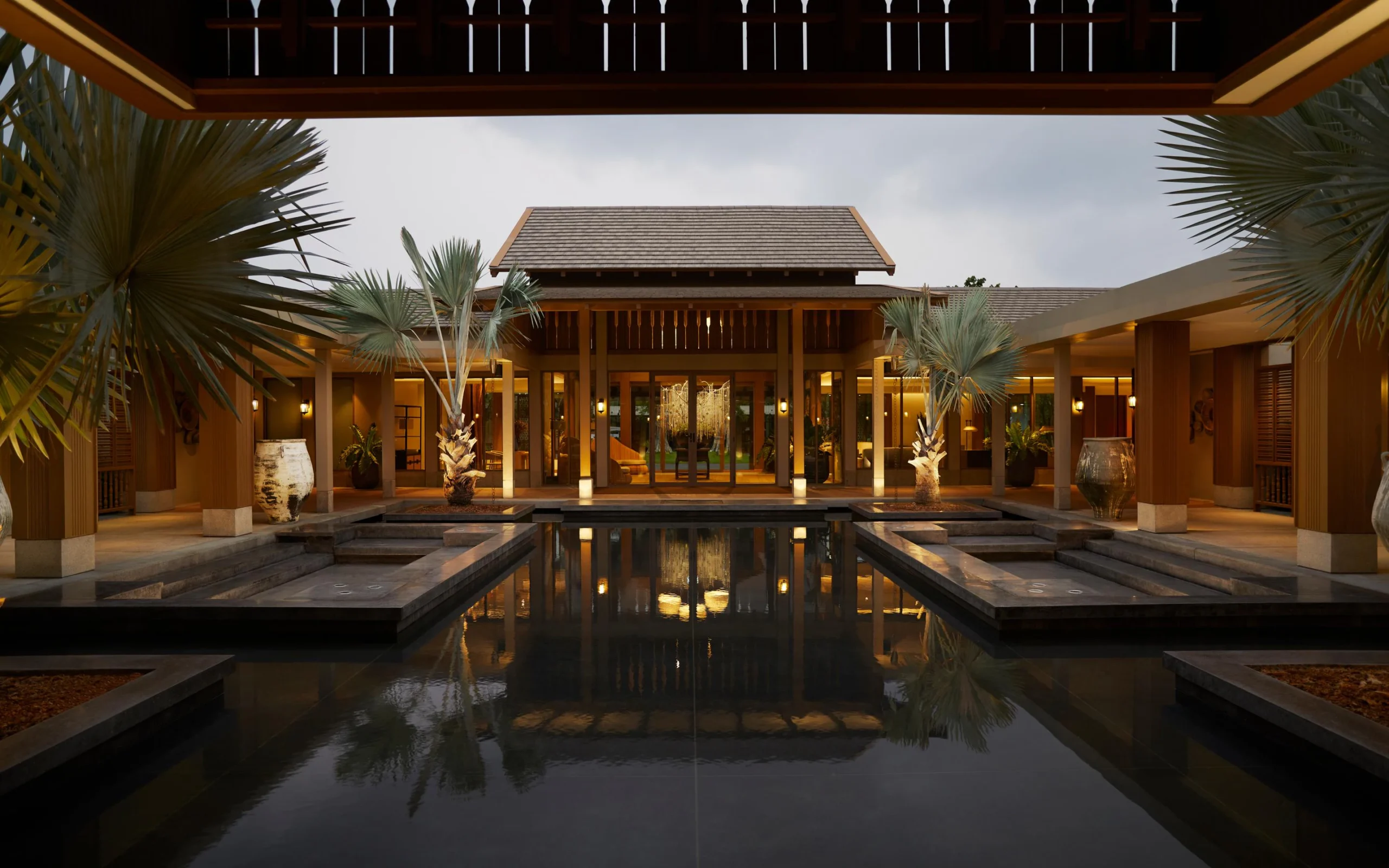 The entrance alone set the tone. Inside the art-filled pavilion, staff in soft cream uniforms greeted me with serene smiles as seven antique singing bowls rang out in sequence, each tone rippling across the water that surrounds the property. It was both ceremony and cleansing: a sound bath that seemed to strip away the last fragments of airport stress. From there, I was escorted by golf buggy through winding lanes lined with frangipani, banana trees, and lush jungle palms to my villa, where calm felt almost tangible.