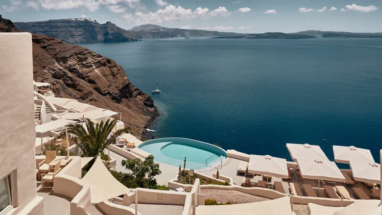 Set on a cliffside above Ammoudi Bay, Santo Mine is a love letter to Mediterranean minimalism. Each suite offers panoramic views of the caldera, private plunge pools, and freestanding bathtubs carved into volcanic stone. The adults-only atmosphere keeps things blissfully serene: perfect for honeymooners who want nothing but each other (and maybe a glass of Assyrtiko wine).