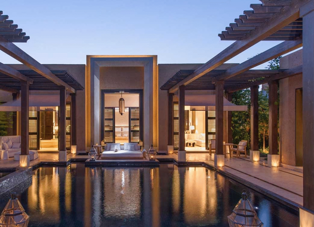 Amanjena is about space and silence. Located just outside the city, it offers a low-density layout of pavilions, still pools, and open courtyards framed by the Atlas Mountains. The design is restrained and symmetrical, encouraging calm without distraction.