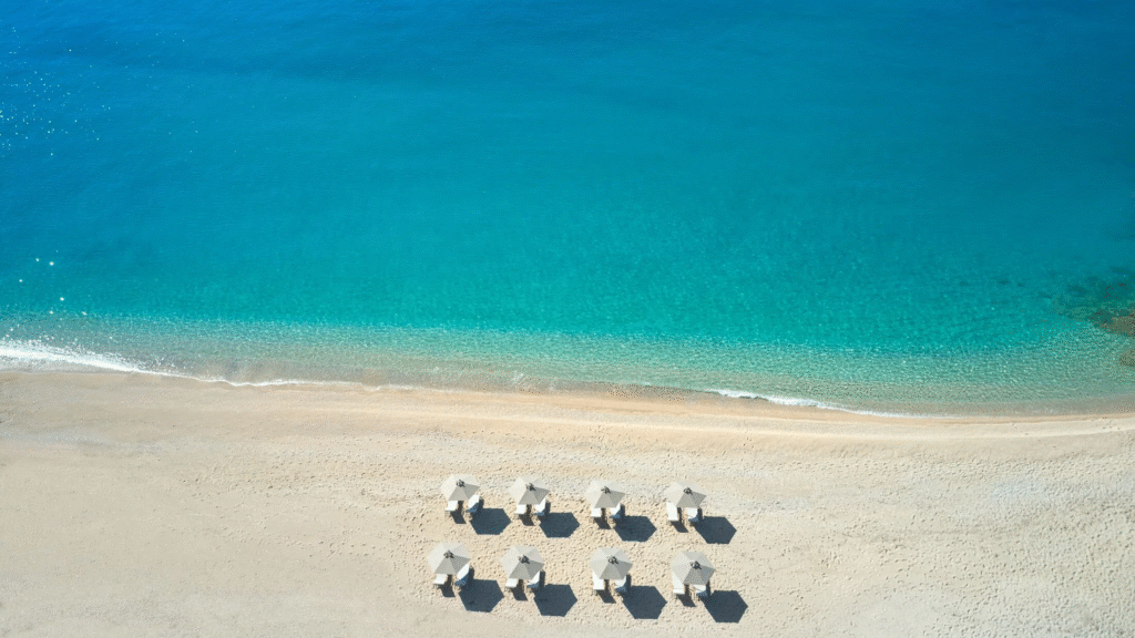 The beach itself is pebbled, natural, and beautifully unmanicured. The water is incredibly clear: that deep, clean blue that makes you want to swim immediately, not just dip your feet.