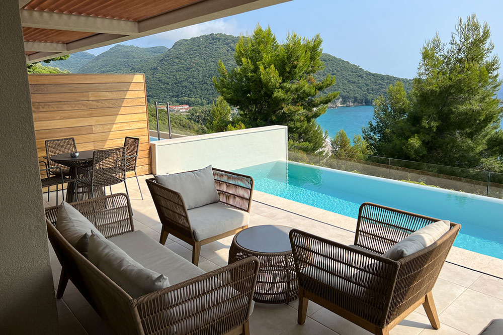 The drive up already sets the tone. Epirus feels different from much of Greece: wilder, quieter, less polished in a way that feels honest. When you arrive at the hotel, there’s no theatrical entrance, no overwhelming sense of “resortness”. The space opens softly, and your eye is immediately pulled outward, straight to the sea.
