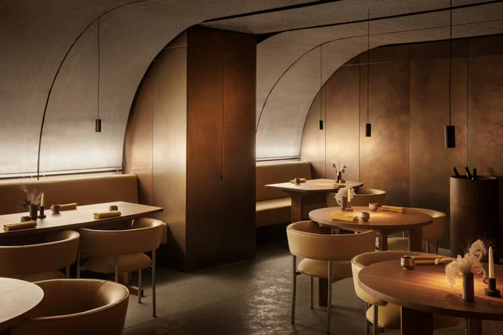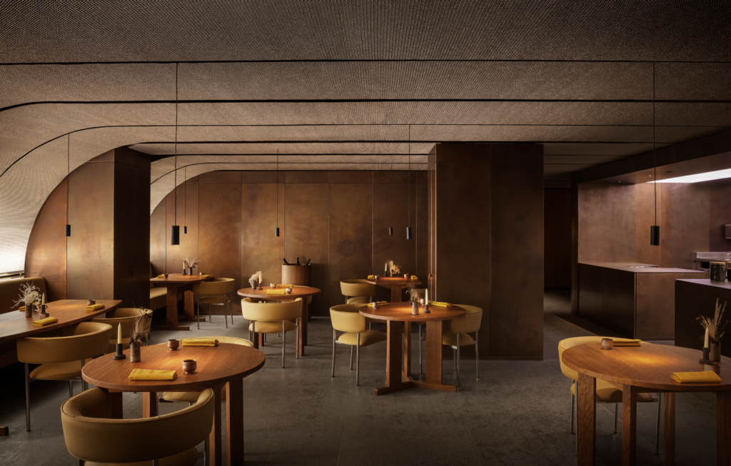 The dining room is a masterclass in restrained drama. Curved walls soften the industrial shell of the building, while steel-mesh ceilings and copper-toned finishes introduce texture and warmth. The palette leans into oxidised metals, muted yellows and earthy pinks, creating a glow that flatters both plate and patron. Nothing here is ornamental for the sake of it. The architecture feels intentional, cohesive, quietly powerful.