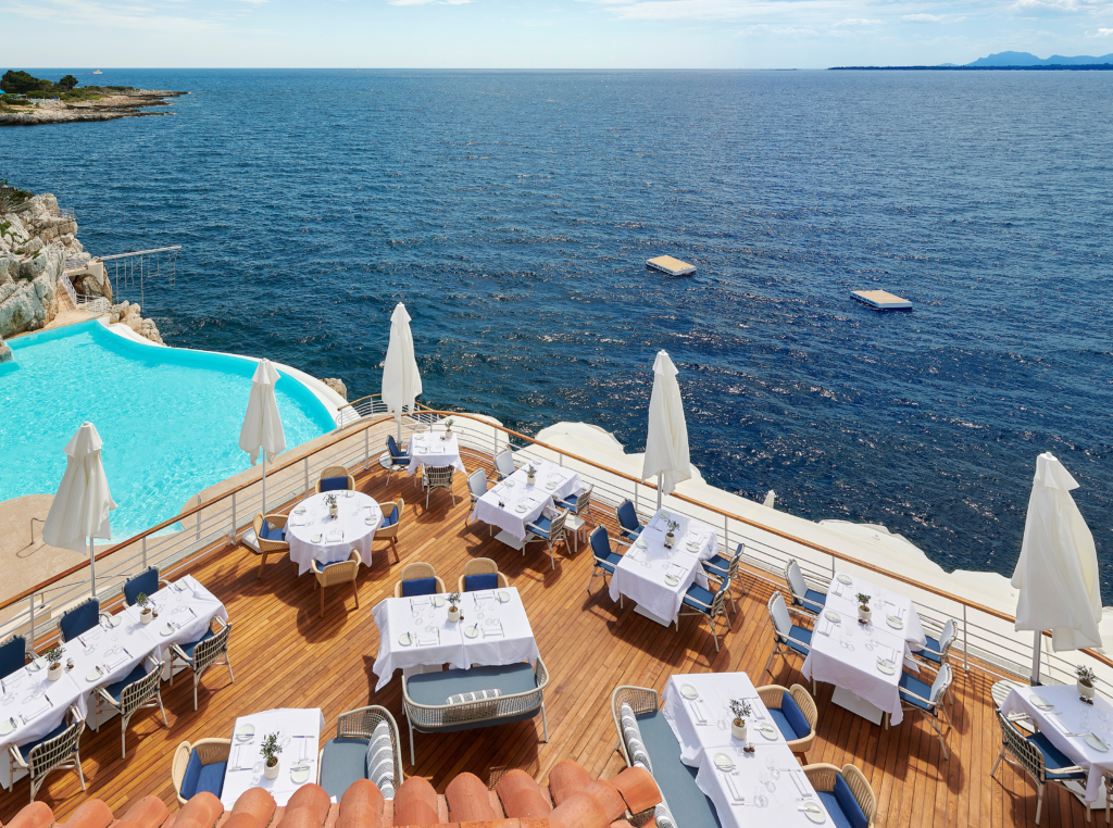 Dining at Eden-Roc Restaurant is as much about theatre as it is about cuisine. Tables are set against the vast sweep of the Mediterranean, pine trees framing the horizon while yachts glide silently below.