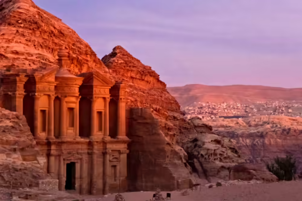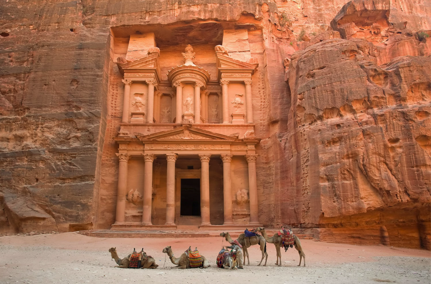 Jordan. Petra at dawn, before the tour groups arrive, is the closest thing available to a landscape that produces awe without preparation or effort. The Treasury emerging from the Siq as you walk through the narrow canyon is an experience that does not require cultural knowledge or historical background : it simply exists at a scale that registers before thought. The scale of the rock-cut city, once you are inside it, continues to operate at the same register for hours.